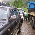 C’est le 14 Octobre, sous la pluie, que nous sommes partis de Kathmandu avec trois 4X4 ( deux Manoj et un pour l’équipe d’ophtalmologistes du Nepal Eyes Hospital ). Notre tentative pour rejoindre Simjung et son dispensaire c’est avérée impossible tant les conditions atmosphériques furent difficiles.