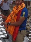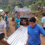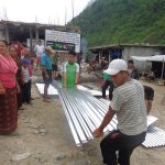 Les tôles métalliques ont été pratiquement toutes acheminées dans la communauté de commune de Simjung. C’est tous ensemble que les habitants participent à la construction, toute provisoire, de leur nouvelles  » maisons  » même les plus agées.