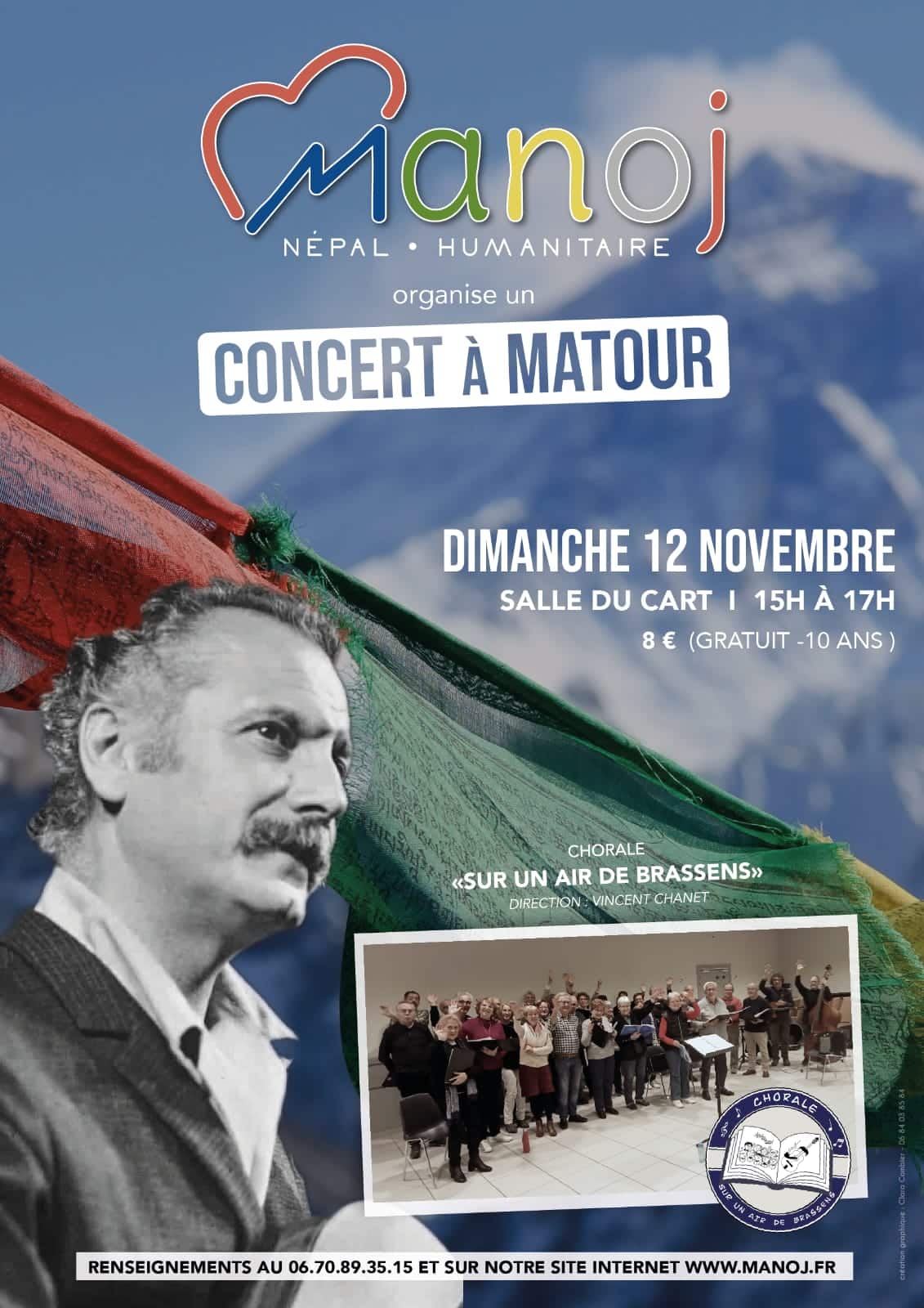 Le dimanche 12 novembre 2023, l’équipe de l’association Manoj vous invite à assister à un concert donné par la chorale dirigée par Vincent Chanet, « Sur un air de Brassens ». Rendez-vous au CART dès 15 heures.