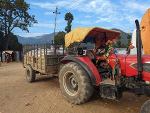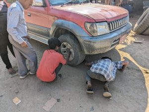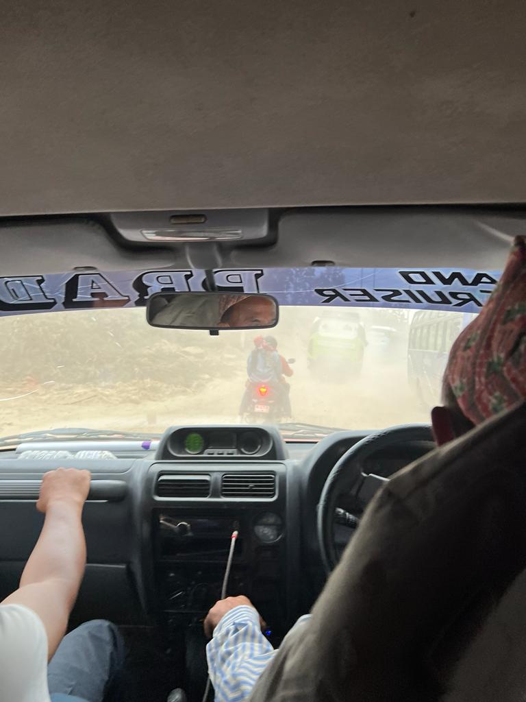 Mardi 28 novembre : départ de l’équipe (Dhan, Thierry et Maëva), rejoints par Gopi (l’épouse de Dhan). 12h de 4×4 dans la poussière… La route est entièrement en travaux, les véhicules avancent très lentement, à environ 40 km/h. Thierry nous dit n’avoir jamais vu autant de poussière.