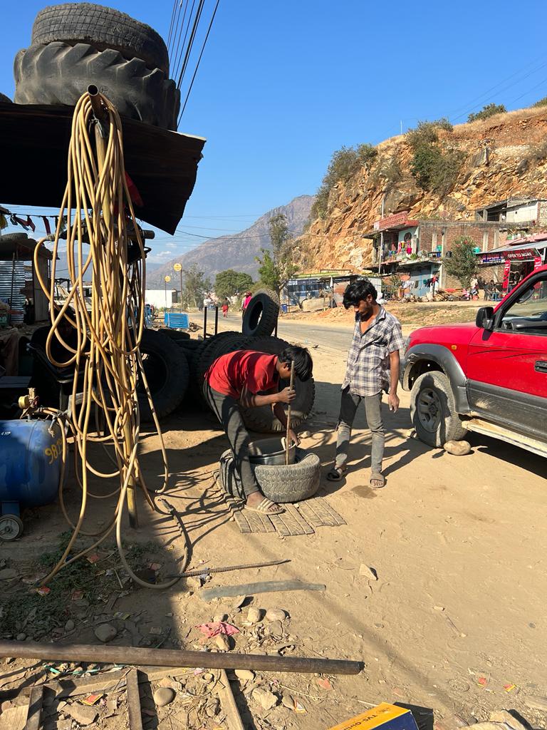 On découvre des paysages différents de ce que nous avons pu connaître dans d’autres régions, l’émerveillement est au rendez vous. De plus, à notre grande surprise (et soulagement) les routes sont correctes aujourd’hui mais que serait un trajet au Népal sans problème ? Celui du jour a été la crevaison d’un des pneu de notre 4×4. Réparation de fortune effectuée, nous avons repris la route jusqu’à notre objectif, le district de Jajarkot. Il nous aura fallu 21h de 4×4 pour ce périple et arriver à Khalanga, la préfecture. Khalanga est une ville en hauteur et aux maisons colorées. Nous ne sommes pas dans les lieux de l’épicentre où le plus de dégâts ont été recensés mais, pour autant, nous pouvons malheureusement constater les traces du tremblement de terre. Quelques tentes sont au bord de la route en guise de logement de fortune. A 17 h nous nous rendons à la préfecture. Ce bâtiment a été évacué car fissuré et très endommagé. Actuellement les bureaux sont sous des tentes ou tout simplement en extérieur pour pouvoir continuer les missions professionnelles.