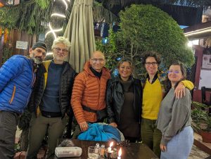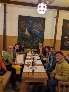 Le retour à Kathmandou a été également l’occasion de retrouver l’équipe du projet « Revoir Sagarmatha. Un trek médical au Népal », de retour de leur trek médical, pour un débriefing. Anita (à côté de Thierry), leur guide, qui a travaillé pour la première fois pour l’association était également présente. Nous avons bon espoir qu’elle encadre de nouveaux treks médicaux et qu’elle rejoigne ainsi l’équipe !