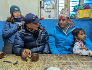 Lundi 27 novembre : arrivée à Kathmandou. L’occasion de croiser Maëva (ayant déjà effectué une mission en 2022 – trek médical et camp de santé ophtalmologique – équipe 14 Novembre) , l’équipe du projet « Revoir Sagarmatha. Un trek médical au Népal » en partance pour leur trek médical, Bhanu (un des guides de notre association) et Dhan, notre coordinateur local.
