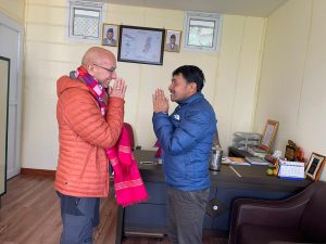 Vendredi 15 décembre : L’équipe se rend au Nepal Eyes Hospital, un partenaire régulier de l’association pour les camps de santé ophtalmologiques : les médecins et infirmières soignant les patient.e.s lors des camps, viennent de cet hôpital. Le nouveau directeur les reçoit dans son bureau, avec le Docteur Kamal qui intervient dans la majorité des camps de santé.