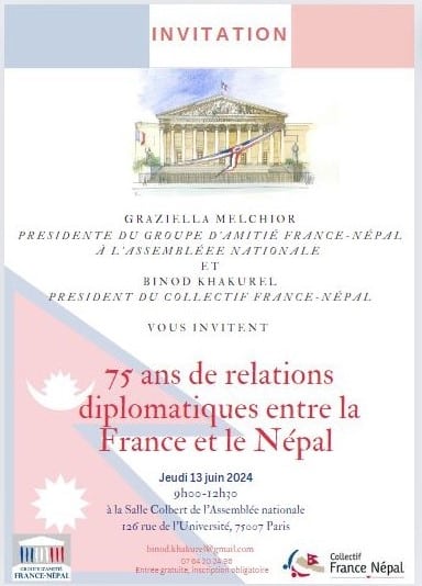 Thierry Giraud, fondateur et président de l’Association Manoj, a été invité à participer, par le président du Collectif France Népal, M. Binod Khakurel, à une matinée de rencontres diplomatiques à l’Assemblée Nationale le 13 juin prochain. Il s’agit de fêter les 75 ans de relations diplomatiques entre la France et le Népal.